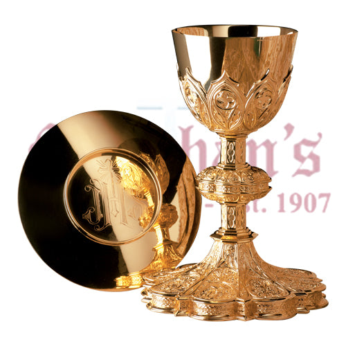 Beautifully crafted, the Gothic Designed Chalice with Scale Paten from Matthew F. Sheehan features an intricate octagonal body with deep, elaborate chiseling to create the design. The chalice and paten are embossed all the way around with a beautiful Gothic design that gives the piece its name. The Chalice and Paten set are made by the expert craftsmen at Artistic Silver and are imported from Spain. These stunning pieces are worthy of even the finest churches and institutions, imparting their beauty and piety to any space. The chalice is available in your choice of Sterling silver with gold plating or an inner Sterling Silver cup with gold plating. The chalice measures 9 1/4 inches high and holds 14 ounces. The paten measures 6 1/4 inches in diameter and is designed to match the finish and design of the chalice.