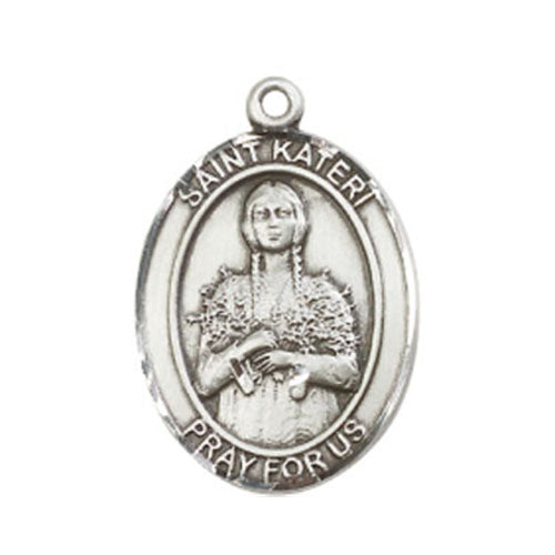 St. Kateri Pendant. The medal measures 1 x 3/4 and is available in Sterling Silver on a 24S Chain, Gold Filled on a 24G Chain and 14 Karat Gold - No Chain. St. Kateri is the patron saint of Environment