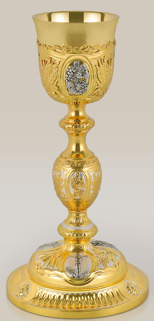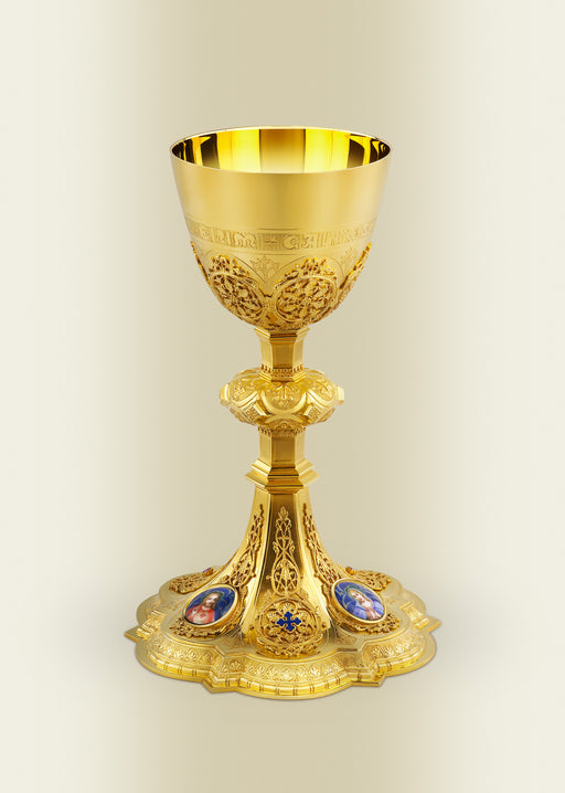 A chalice or communion cup is a decorative goblet that is intended to hold a drink. Catholic chalices are often used to hold wine during the Eucharist. Chalices are most often made of metal and may be finely decorated or encrusted with jewels. References to gold or silver chalice use may be found throughout scripture and it is not uncommon for a newly ordained person to be presented with gifts of various chalices from friends and family members. We offer select styles of chalices that may be engraved for a small additional charge.