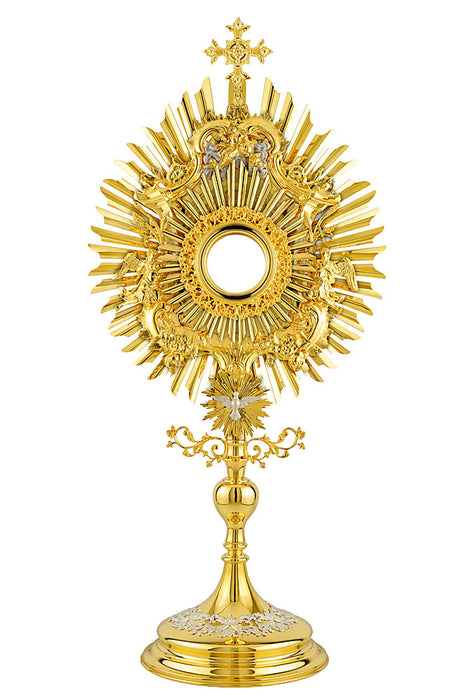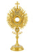 Glass luna for 2 3/4" host, 30 3/4" Ht. Carrying case included. Gold plated brass, silver dove and filigree around base, small stones in cross