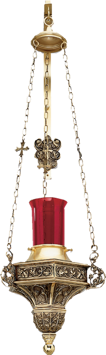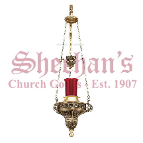 Add a touch of Gothic style in your church with this fine Gothic-style sanctuary lamp. This handsome sanctuary lamp features detailed filigree decorations and chains that are ornamented with crosses. This hand-crafted sanctuary light is made with stunning finery in Spain and is available in either a brass finish or a silver-plated finish. This piece of art is guaranteed to be a meaningful sanctuary decoration that will be enjoyed for many, many years. The total height of this sanctuary lamp is 42" with the included chain; the globe is not included. The main body of this gothic sanctuary lamp is 12.75" high with a 10.25" diameter. Matthew F. Sheehan has been the leader in premium church goods and religious items since 1907. Please allow us to assist you with this purchase by contacting us at 888-712-0205.