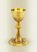 8 5/8" Ht. 10 oz capacity, case included. Gold plated brass, sterling silver cup. Colorized images of Jesus and Mary around base, blue cross on base.