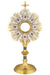 Glass luna for 2 3/4" host, 29 1/2" Ht. Carrying case included. Gold plated brass, two-tone silver and gold, purple stones within rays, red and blue stones around luna, small red and blue stones in node, blue accents in stem, colored medallions around base, red stone in cross