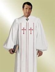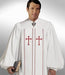 The "Cleric" Robe from Murphy is ideal for summer and special occasion use, this clergy robe is hand tailored in Wonder Crepe and accented with red corded piping and embroidered red Latin Crosses.